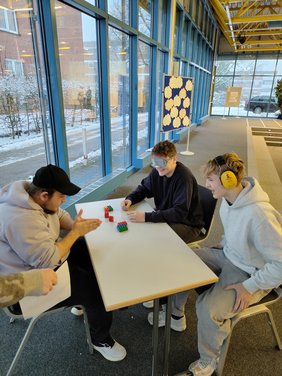 Taub, blind oder stumm – nachvollziehen, wie mit bestimmten Nachteilen umgegangen wird, konnten die Schüler an einer weiteren Station. Ein Schüler wurde dabei mit Kopfhörern ausgestattet, sein Gruppenpartner mit einer Augenmaske und ein weiterer durfte nicht sprechen. Ziel war es, trotz der jeweiligen Nachteile, gemeinsam ein Modell aus Bausteinen