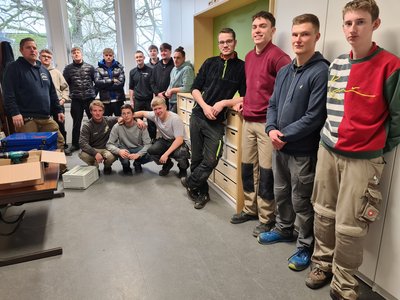 Auch in diesem Jahr konnte sich wieder eine Grundschule über ein neues Möbel aus der Holzwerkstatt des BKB freuen. Die Schüler der Klasse HT21 entwarfen, auf Grundlage eines „Wunschzettels“ der Kolleg:innen der Lambertischule, eine Schrankwand mit viel Stauraum. Auch von Seiten des Lehrerteams im Bildungsgang Holztechnik am BKB gab es Vorgaben. Bei allen Projekten sollen Funktionsteile, insbesondere viele Schubkästen, vorhanden sein. Die neue Schrankwand bietet, neben viel Stauraum für Unterrichts- und Fördermaterialien, auch eine Magnetwand für Notizen und einen Laptop-Arbeitsplatz. Für Arbeits- und Bastelmaterial befinden sich unterhalb des Arbeitsplatzes insgesamt 18 handgefertigte Schubkästen sowie sechs Auszüge für Papier. Während der dreiwöchigen Planungszeit wurden, gemeinsam mit den Lehrer:innen Doris Braun, Sebastian Hüwel und Daniel Schulze Zumloh, zunächst vier unterschiedliche Entwürfe entwickelt. Anschließend erfolgte die Planung des ausgewählten Entwurfes. Es wurden Maße, Materialien und die Konstruktion festgelegt, CAD-Zeichnungen angefertigt, Materialmengen berechnet und der Fertigungsablauf geplant. Schließlich wurden die Möbel in der Werkstatt des BKB, unter der Anleitung von Sven Huesmann, gefertigt. Bereits im Vorfeld konnten Sponsoren für einen Teil der Materialien gefunden werden. Die Schubkästen wurden von den Auszubildenden handwerklich gezinkt. Die Möbelkorpusse wurden mit modernen Technologien (HomagCUBE, 5-Achs-CNC Bearbeitung) im Sinne der digitalen Fertigung hergestellt. Bei der Auslieferung und Montage am 18.12.2023 waren alle Schüler der Klasse HT21 beteiligt und präsentieren stolz das Ergebnis. Als Dankeschön gab es ein tolles Frühstück in der Lambertischule.
